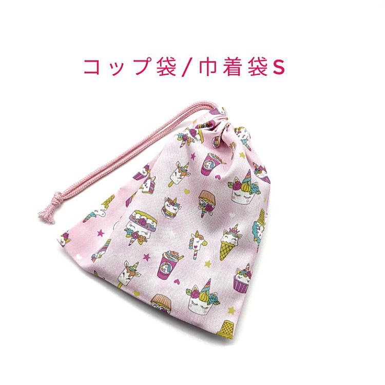 > コップ袋・巾着袋S【スイーツユニコーン柄 ピンク】マチ無し ランチ袋 ナフキン入れ ポーチ 給食袋 入園 入学 女の子 ケーキ アイス