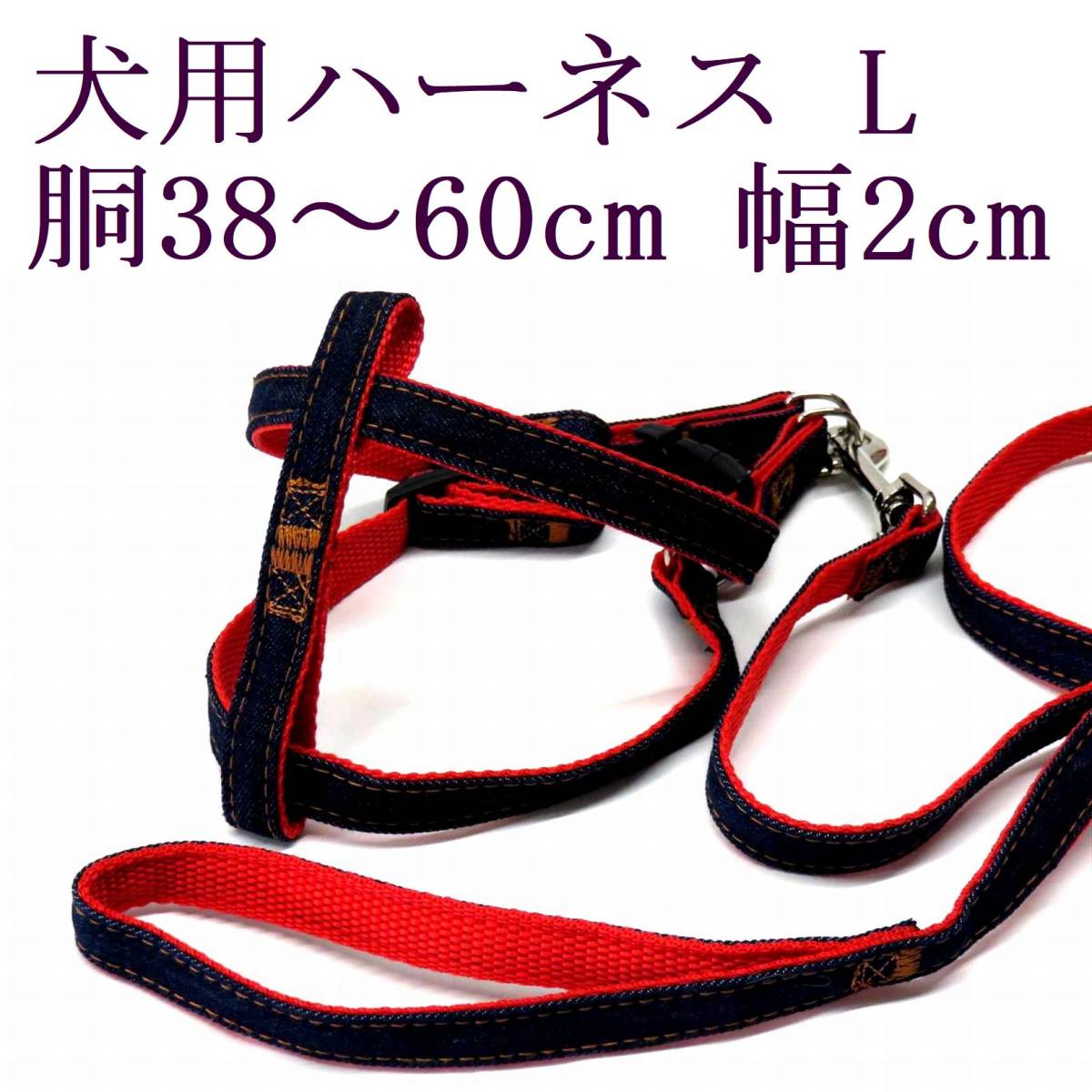 > ハーネス リード セット 赤 L デニム 中型犬 大型犬 胴回り38~60cm前後 リード 110cm 幅2cm レッド 散歩 ペット用品 新品 送料無料