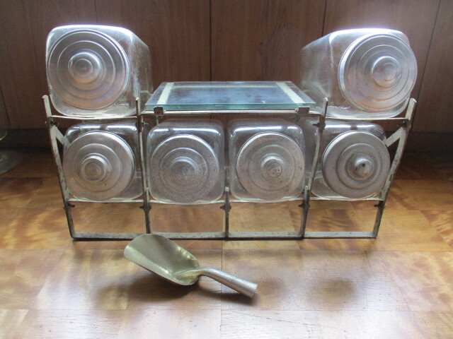 - ガラス瓶6個アイアンスタンド スコップ付き 駄菓子屋さんディスプレイキッチン雑貨ディスプレイレトロアンィーク