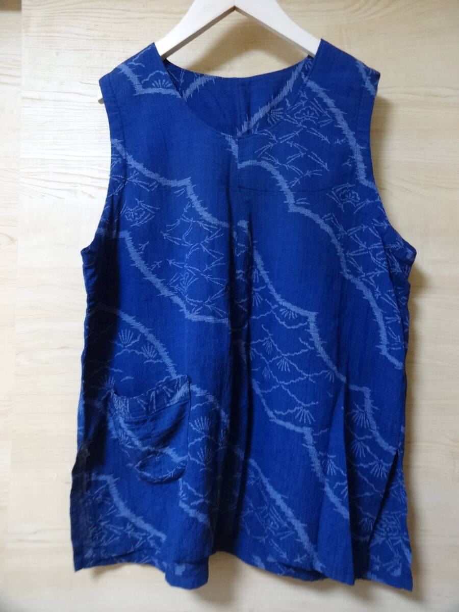 - 着物リメイク チュニックベスト R8378 紺系 ちぢみ? 前にポケットあり