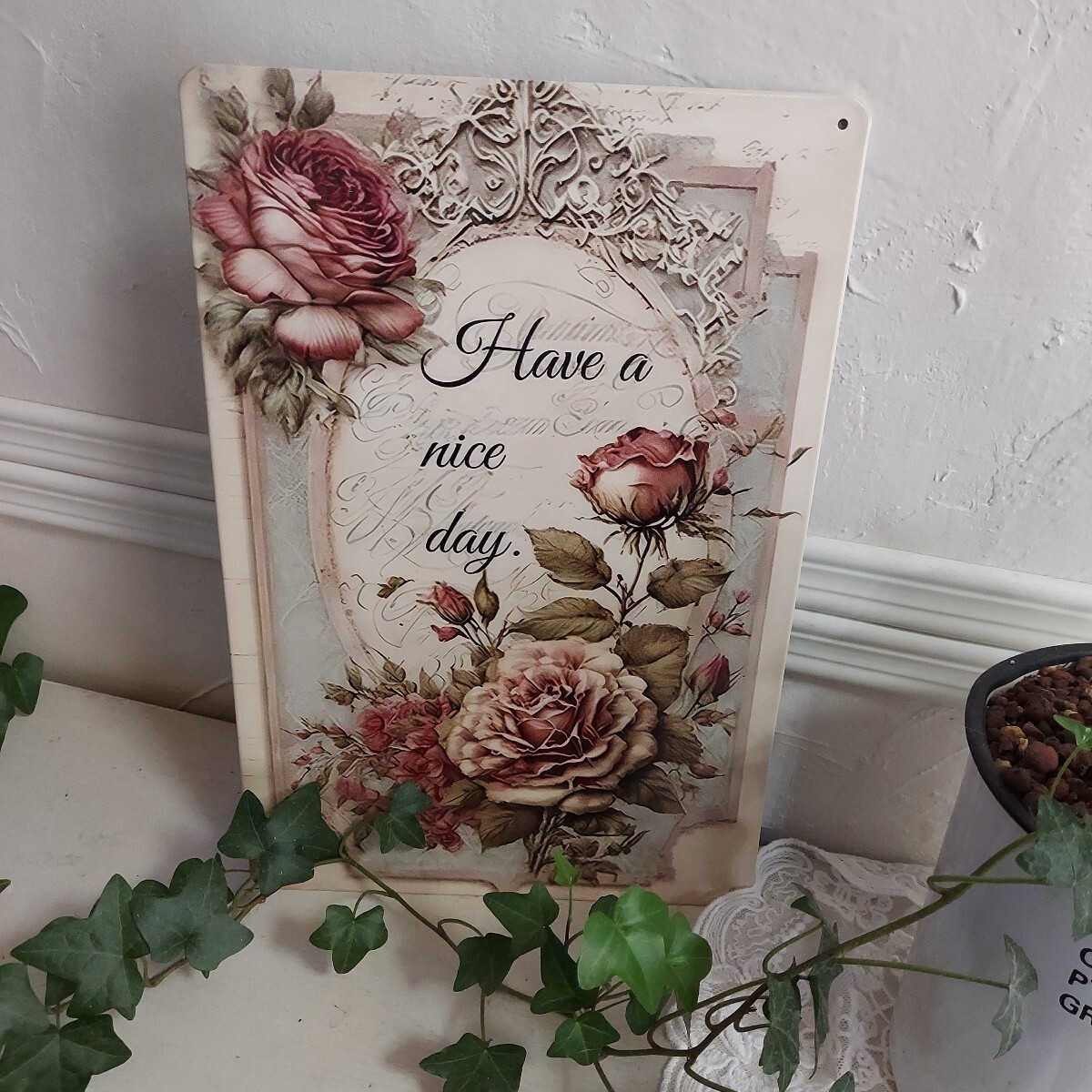 - アンティーク風 ブリキ 看板 サインプレート ガーデン 雑貨 ヴィンテージ風 送185 インテリア 未使用 アンティークローズ 薔薇