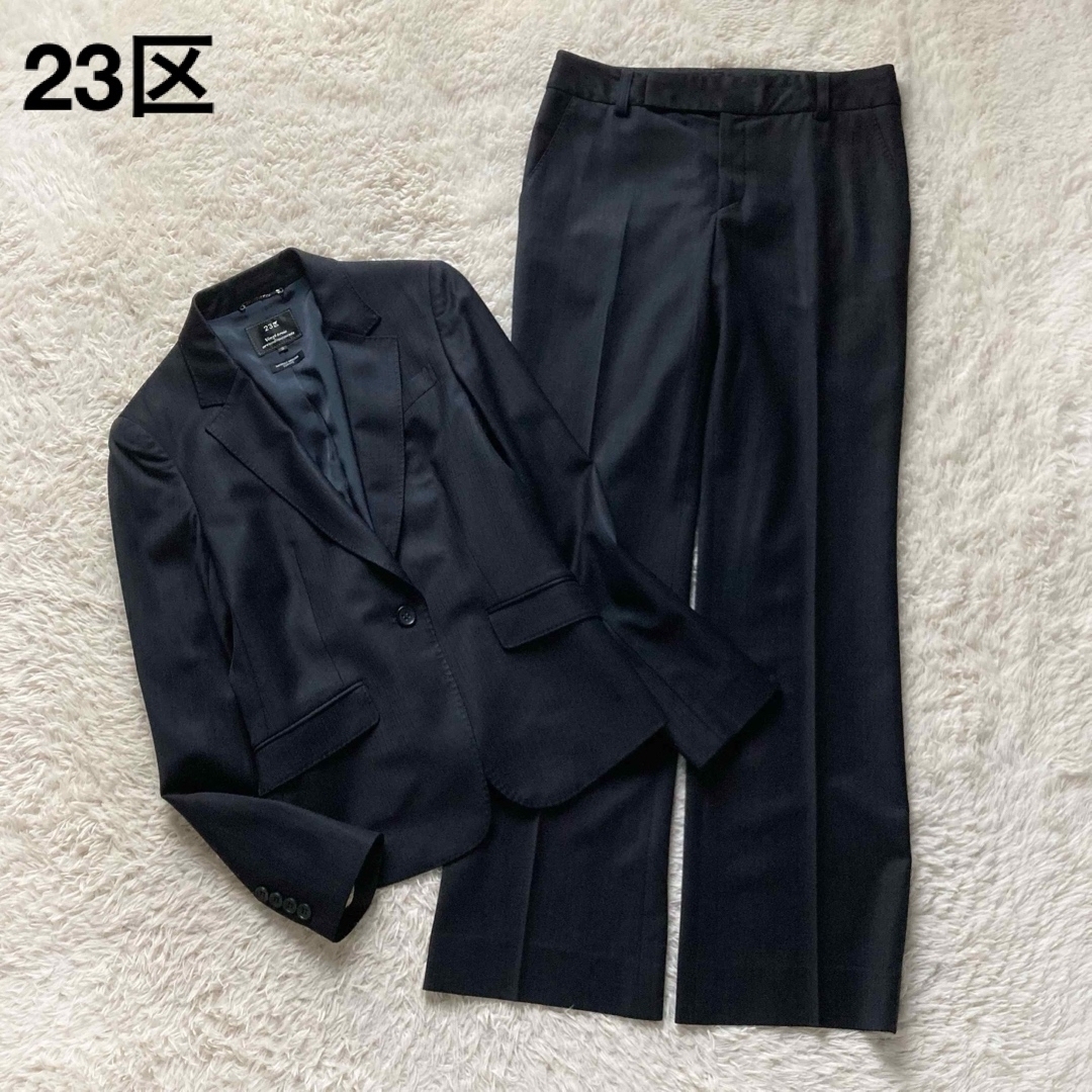 - *23区 パンツスーツ 上下セット ストライプ テーラードジャケット スラックスパンツ ヨーロッパ製生地 ネイビー 紺 38サイズ