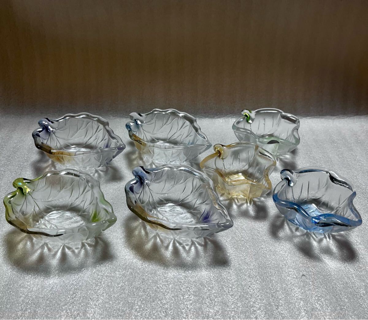 - 未使用 新品 葉型 ガラス 小鉢 小皿 7点 セット ブルー イエロー お洒落 可愛い レトロ デザート カップ アンティーク 木の葉