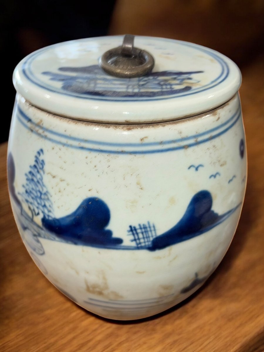 > 【FU10】中国買付品 中国雑貨 中国美術 山水染付 風景 小壺 蓋つき インテリア 骨董 水差し アンティーク 骨董