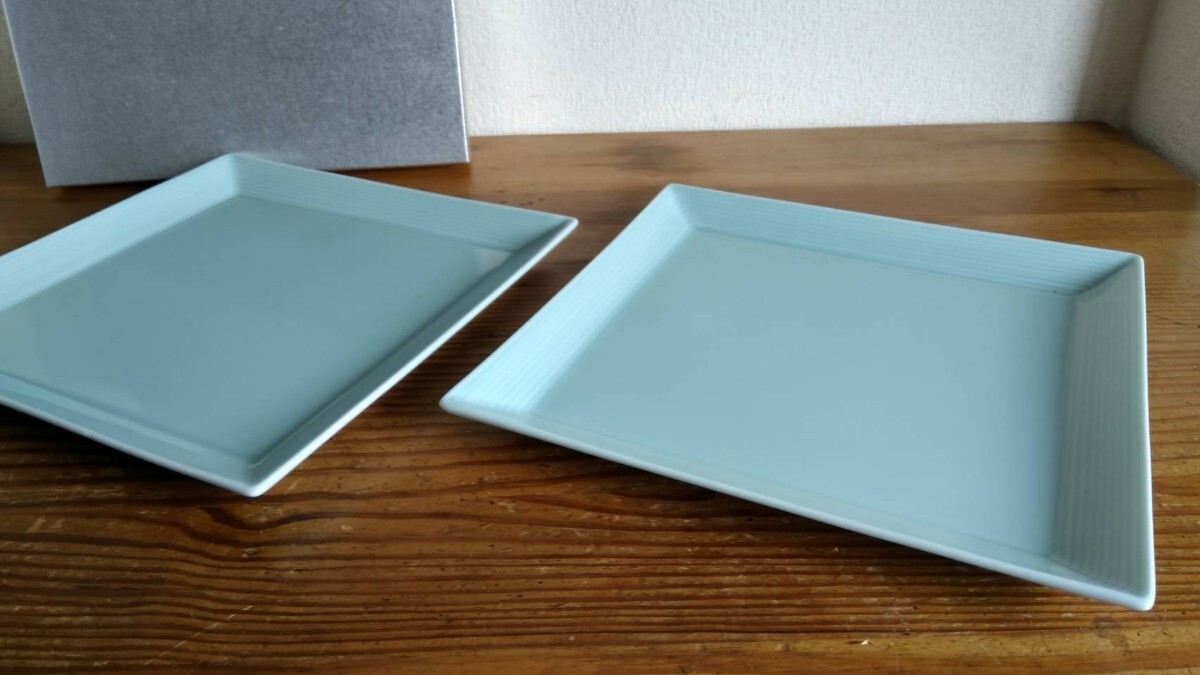 - ■【未使用品】青磁調 スクエアプレート 2枚セット ストライムプラム 22x22xh1.8cm