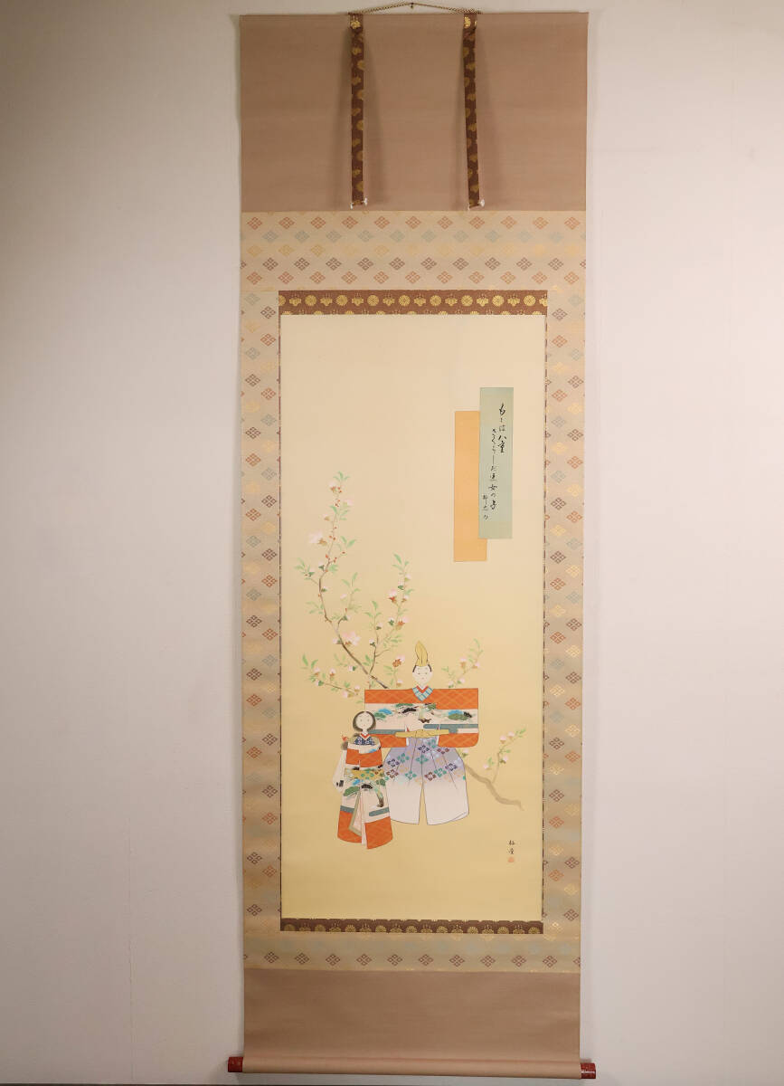 - 【真作】日本画 岩本栖堂「御雛」絹本 掛け軸 木箱 雛祭り 節句 女の子 彩色 金彩 MA647