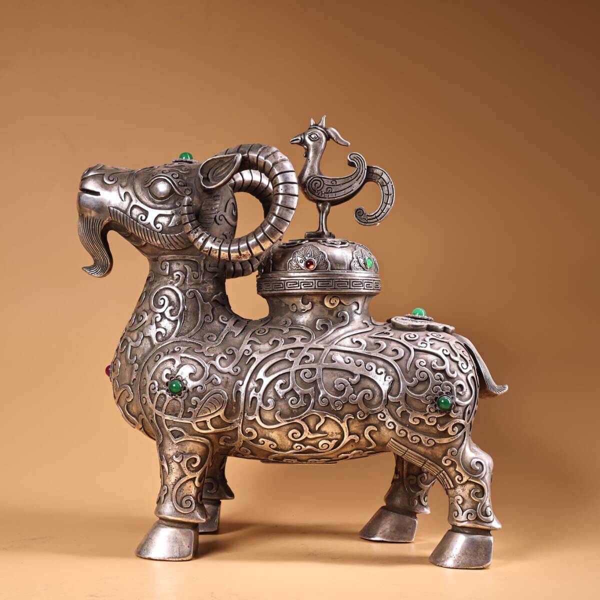 - 蔵友旧蔵出 銅製 銀鍍 寶石嵌 羊尊熏香爐 貴重品 置物 古賞物 中国古玩 中国古美術品