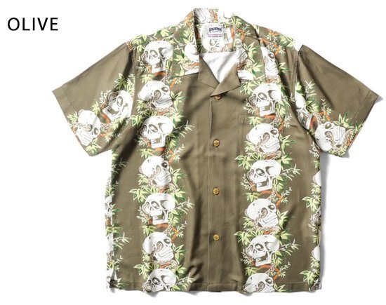- レーヨンアロハシャツ「骸骨」 ◆HOUSTON オリーブ XLサイズ 41201 ヒューストン 和柄 和風 ハワイアン 髑髏 ドクロ