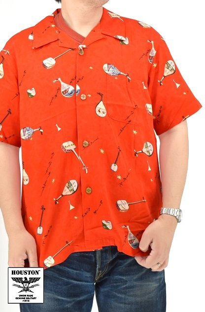 > レーヨンアロハシャツ「和楽器」◆HOUSTON オレンジ XLサイズ 41202 ヒューストン 和柄 和風 ハワイアン