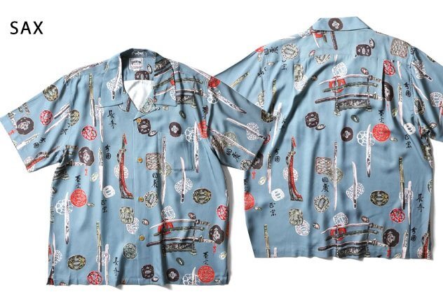 - レーヨンアロハシャツ「日本刀」◆HOUSTON サックスMサイズ 41203 ヒューストン 和柄 和風 ハワイアン