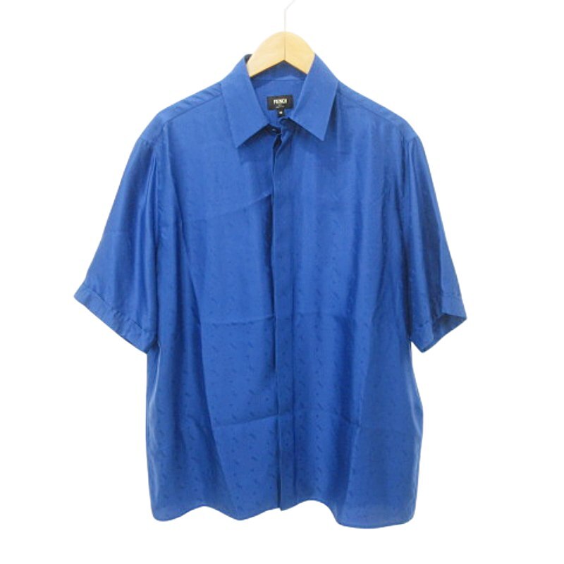 - フェンディ FENDI 美品 21SS シルク シャツ ブラウス 半袖 ブランドロゴ イタリア製 39 約M~Lサイズ 青 ロイヤルブルー ☆AA★ メンズ