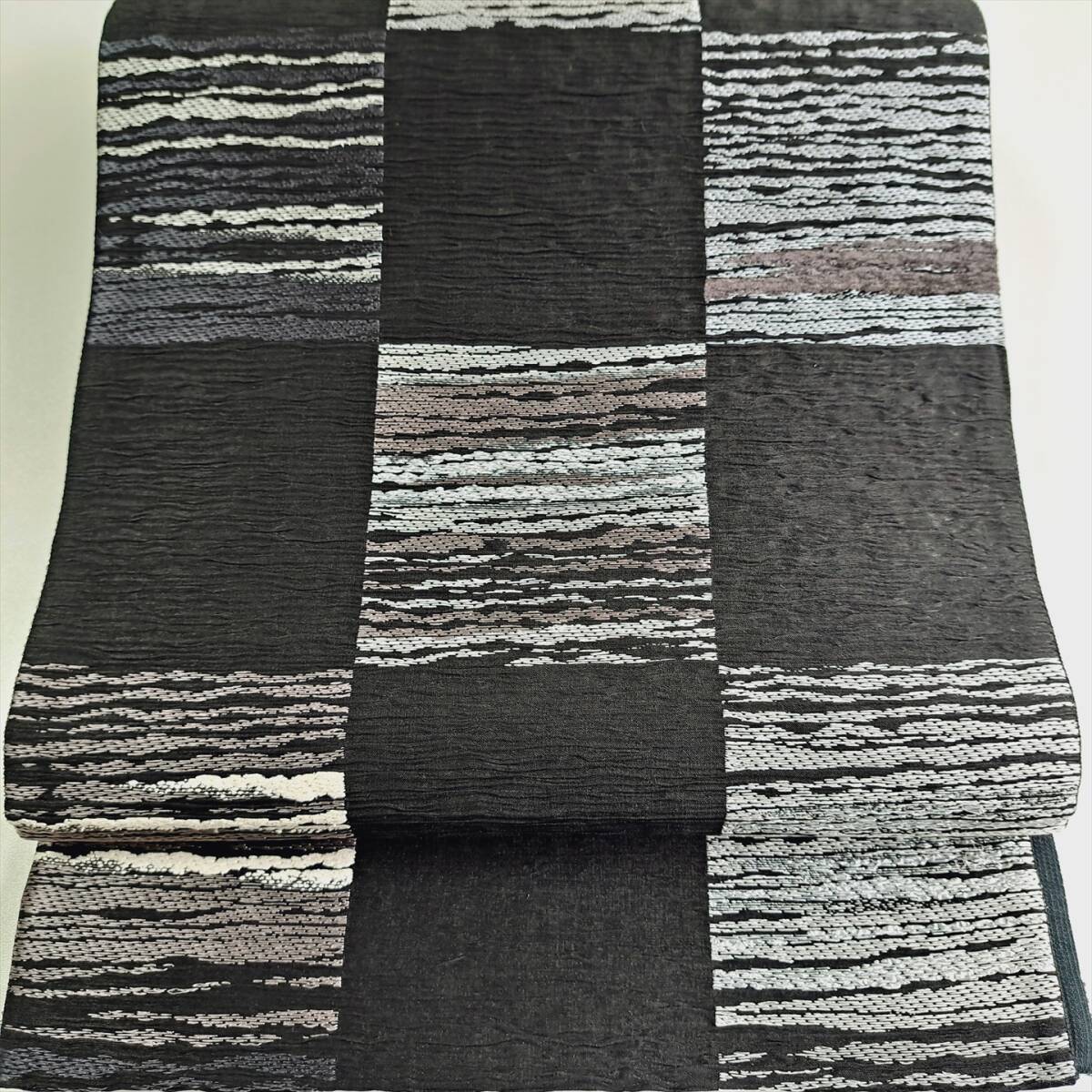 > 即決■着物の越田■幅30.5長さ445 正絹 袋帯 洒落袋 市松模様 オシャレ 上質 黒地 銀糸 D◇へ28J14