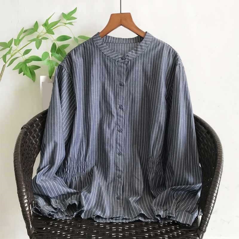- 新入荷ストライプ柄 スタンド襟 フリーサイズ ワイシャツ チュニック トップス 綿100% 大人可愛 ナチュラル ネイビーお色選択可