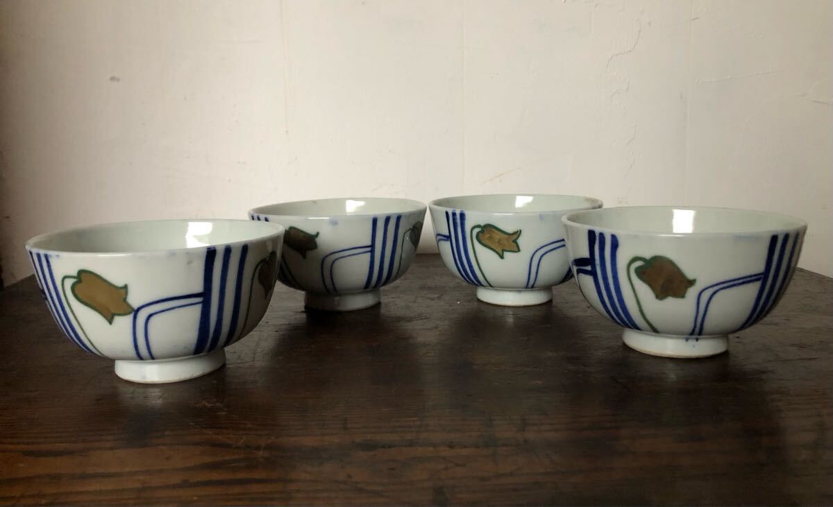 - 染付 茶碗/向付/懐石/ 和食器/ 陶器/ 花柄/骨董/アンティーク