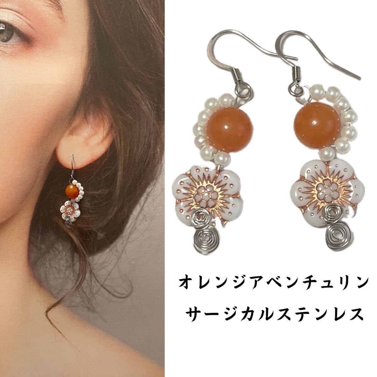 > W116. 天然石 ピアス オレンジ アベンチュリン ハンドメイド サージカルステンレス アレルギーフリー ニッケルフリー