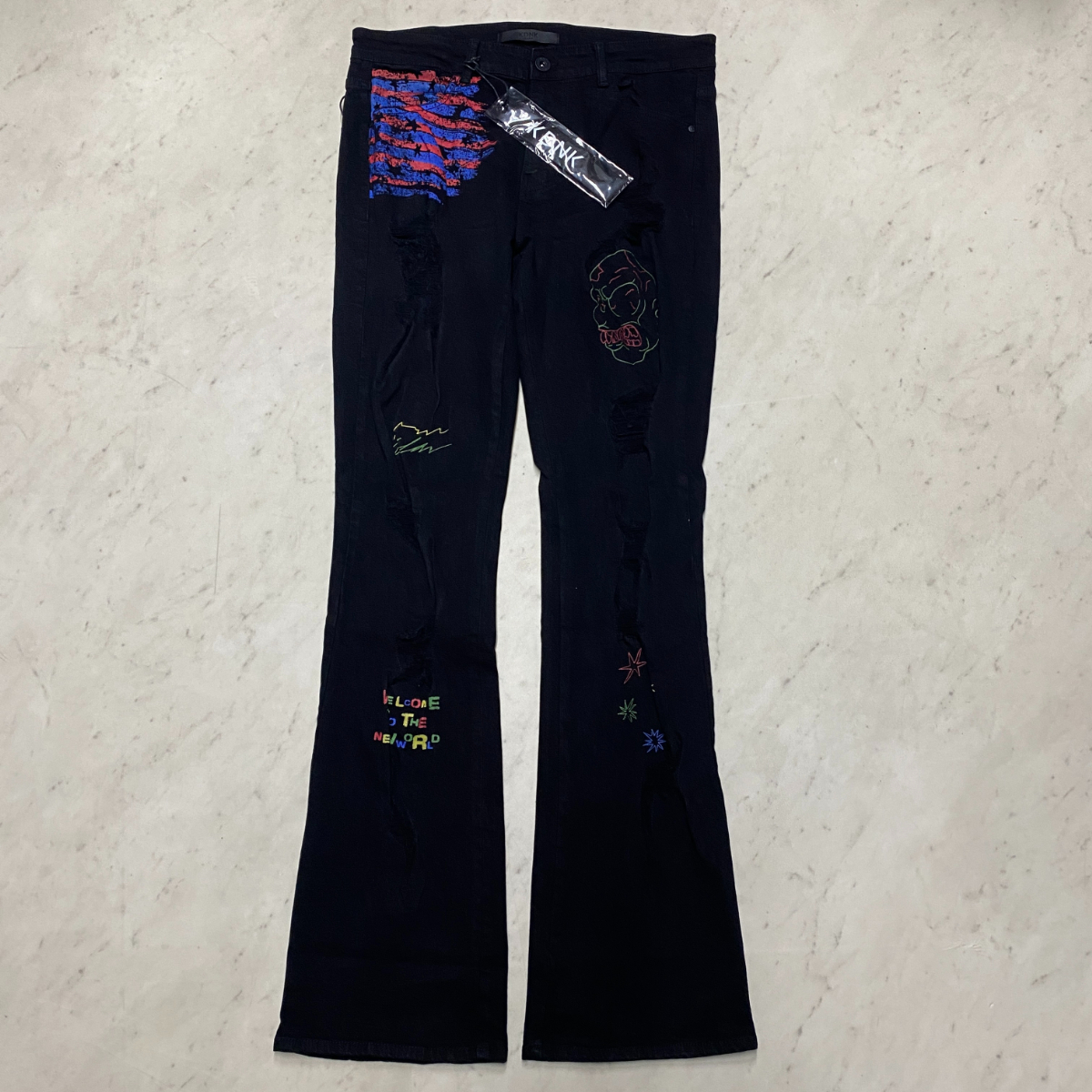 - 海外限定 【W34/L36】 KDNK ディーケーエヌケー Stacked Skinny Flare スタックド スキニーフレア ジーンス 落書き USA正規品 BLK (JNS49)