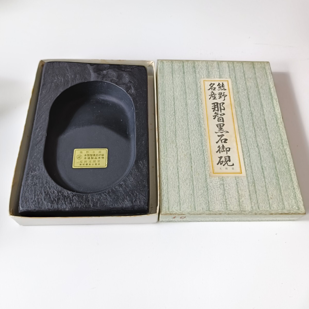 - 熊野名産 那智黒石御硯 疋田文照堂 19.8cm×13.4cm×高さ3.6cm 重さ1954g 未使用品 [ 書道具 硯 本那智黒石 本物 日本製 すずり]