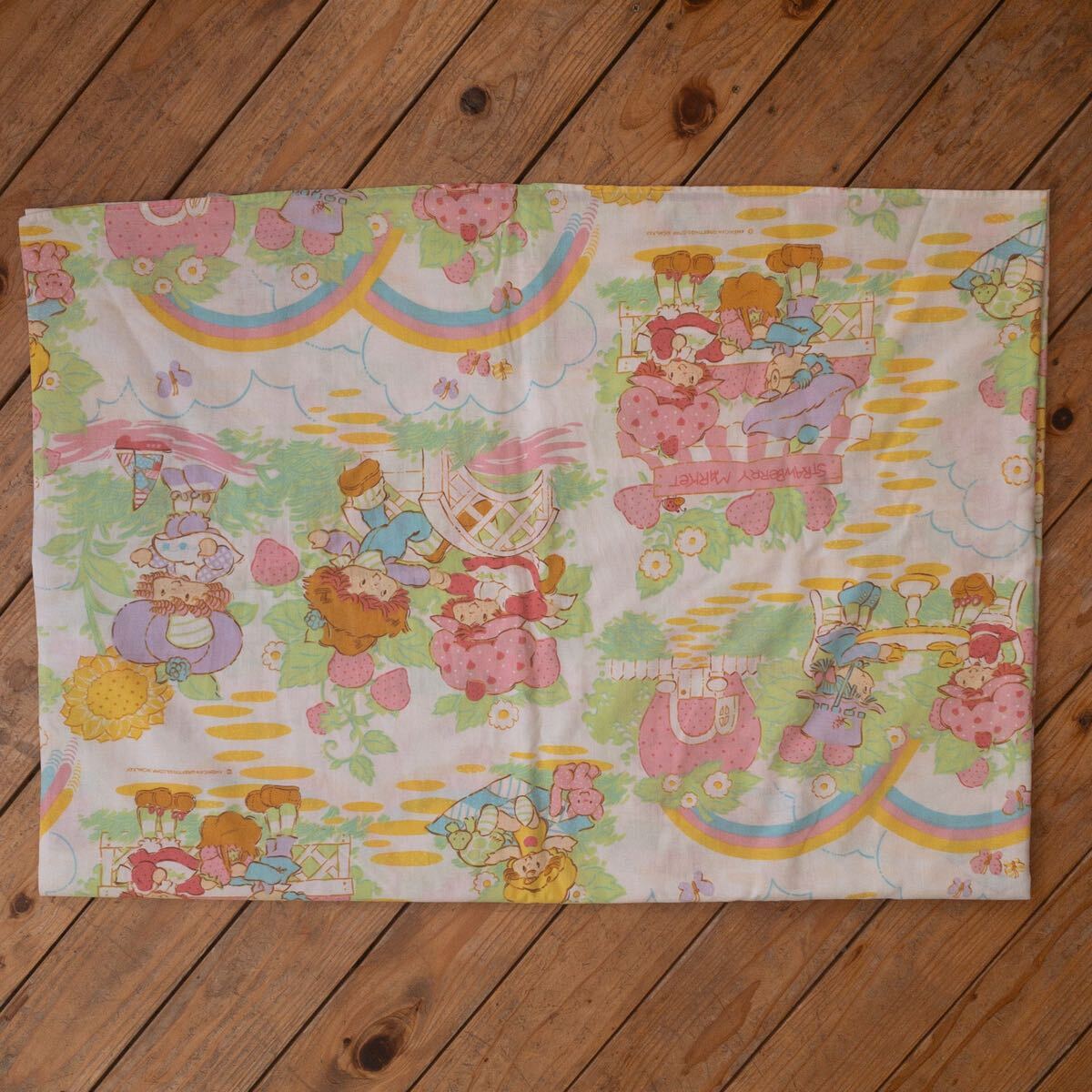 > USAヴィンテージ ベッドシーツ ストロベリーショートケーキ リメイク生地 素材 ポップ 可愛い イチゴ フラットシーツ アメリカ仕入 B2745
