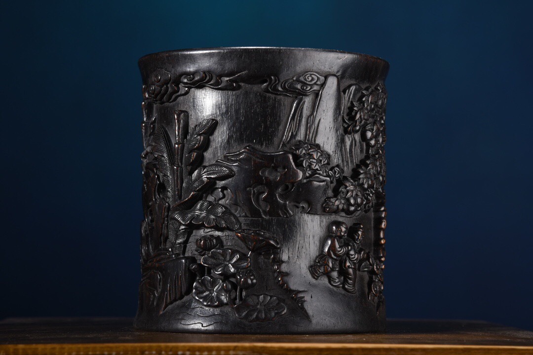 - 蔵友旧蔵出 烏木製 細密彫 嬰戲図 筆筒 希少珍品 貴重品 置物 古賞物 中国古玩 中国古美術品