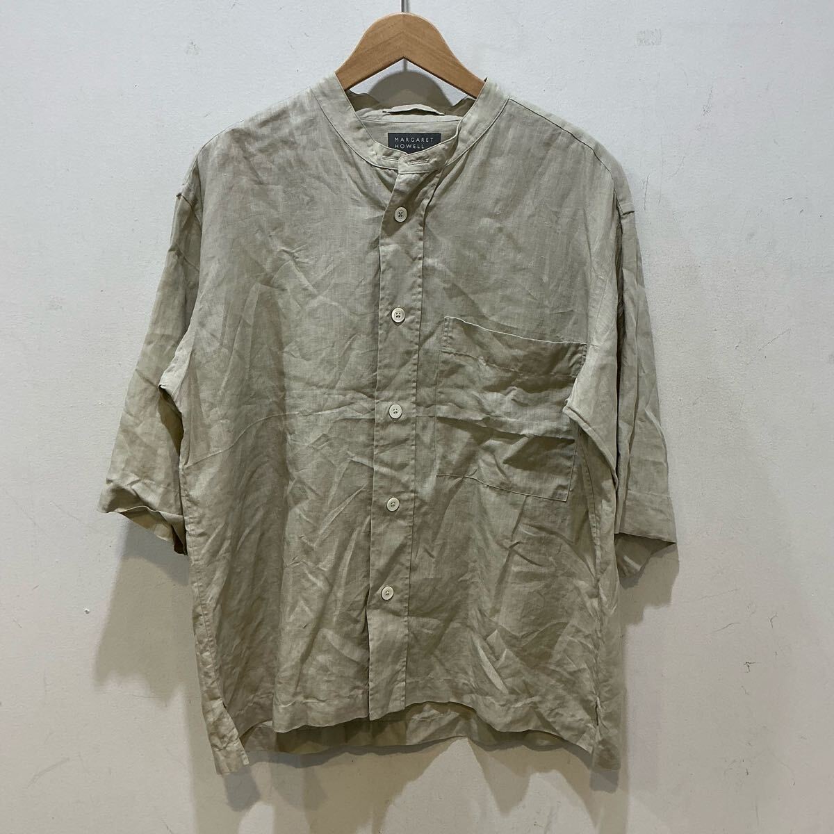 > Margaret Howell マーガレットハウエル LINEN SHIRT リネン 麻 半袖 シャツ バンドカラー グリーン Lサイズ 690604