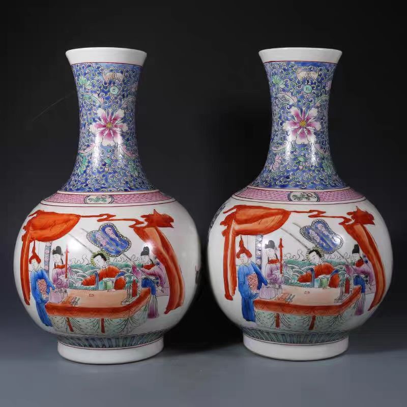 - 清時代 雍正年製款 古陶磁器 粉彩 人物故事紋 賞瓶 一対 花瓶 磁器 文案置物 擺件 時代物 古董品 骨董 旧家蔵出し 唐物 中国古玩 古美術品