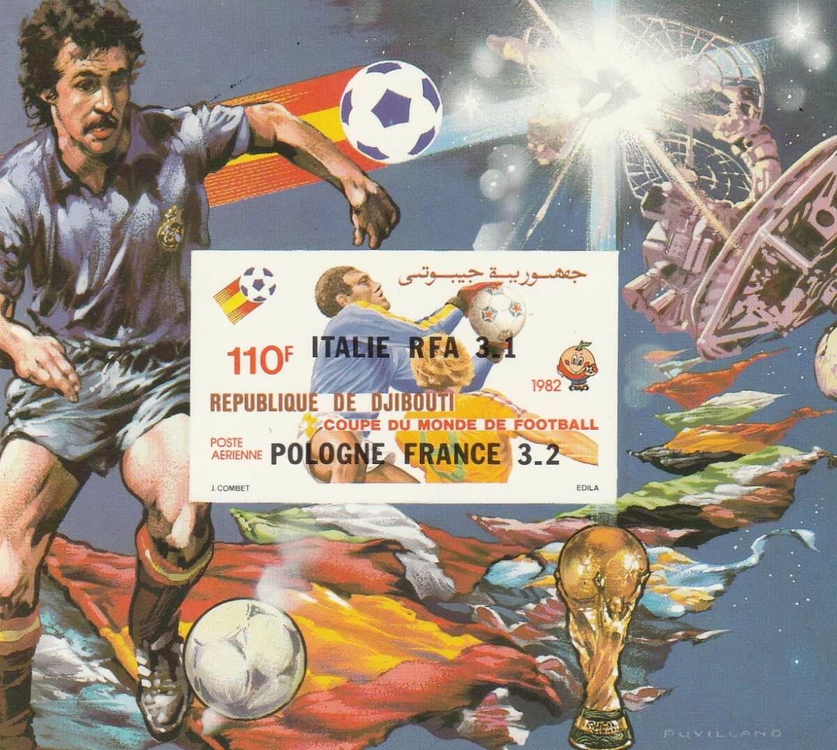 - (ジブチ)1982年ワールドカップ加刷版無目打ち小型シート2種完、マイケルカタログ評価34ユーロ(海外より発送、説明欄参照)