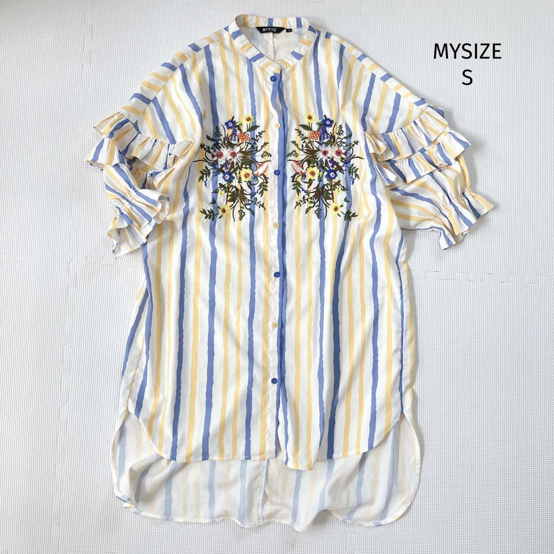 - MYSIZE 膝丈ワンピース【S】八分袖 花柄刺繍 ストライプ ボヘミアン