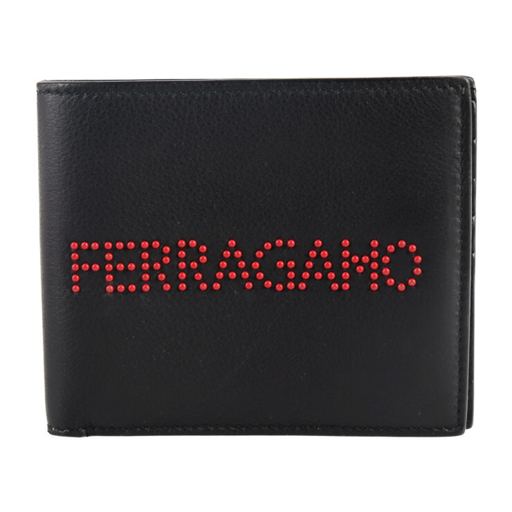 - 美品 サルヴァトーレ フェラガモ 札入れ 二つ折り財布 66 A376 レザー 黒 赤 マイクロスタッズ ロゴ【本物保証】