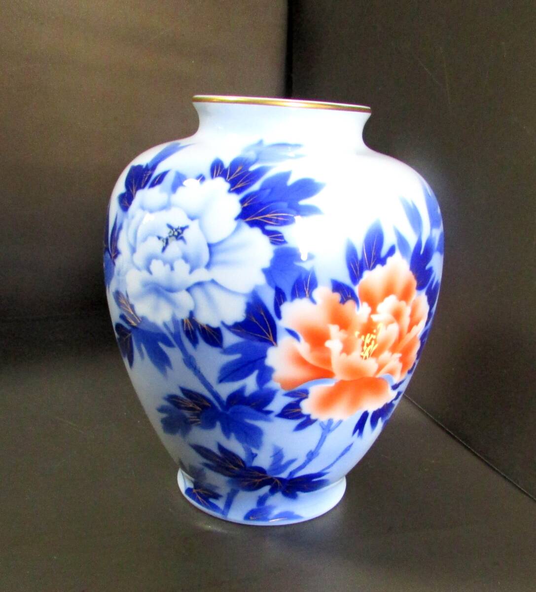 - 深川製磁 花瓶 花入 花器 インテリア置物 赤白薔薇 胴径:(約16㎝xH20㎝)