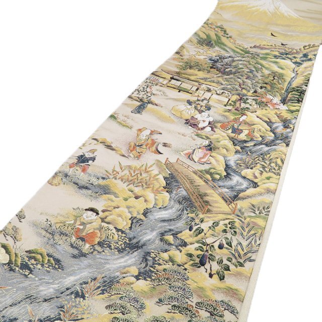 - 袋帯 中古 リサイクル 正絹 フォーマル 六通 風水の綴帯 十壽円満図 七福神 箔糸 金通し 枯草色 多色 金 きもの北條 A1206-10