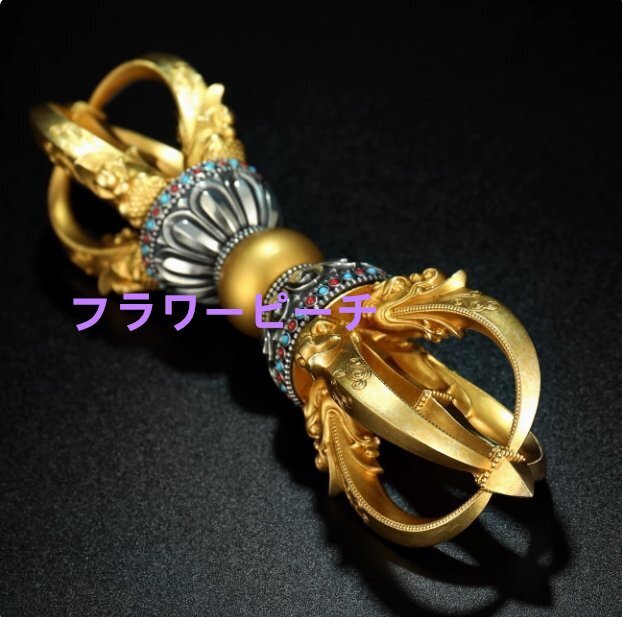 - 密教法具「五鈷杵」真鍮製 最高級品 密教呪術の中核的ツール 密教法具の王者 金剛杵 杵形 寺院ギフト用 魔除け お守り (高さ13.5 cm)