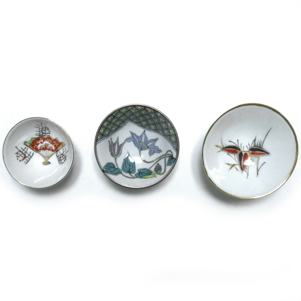 - 九谷焼等★玉竜等 盃 花・七宝繋ぎ文様 扇文様 笹文様 3種