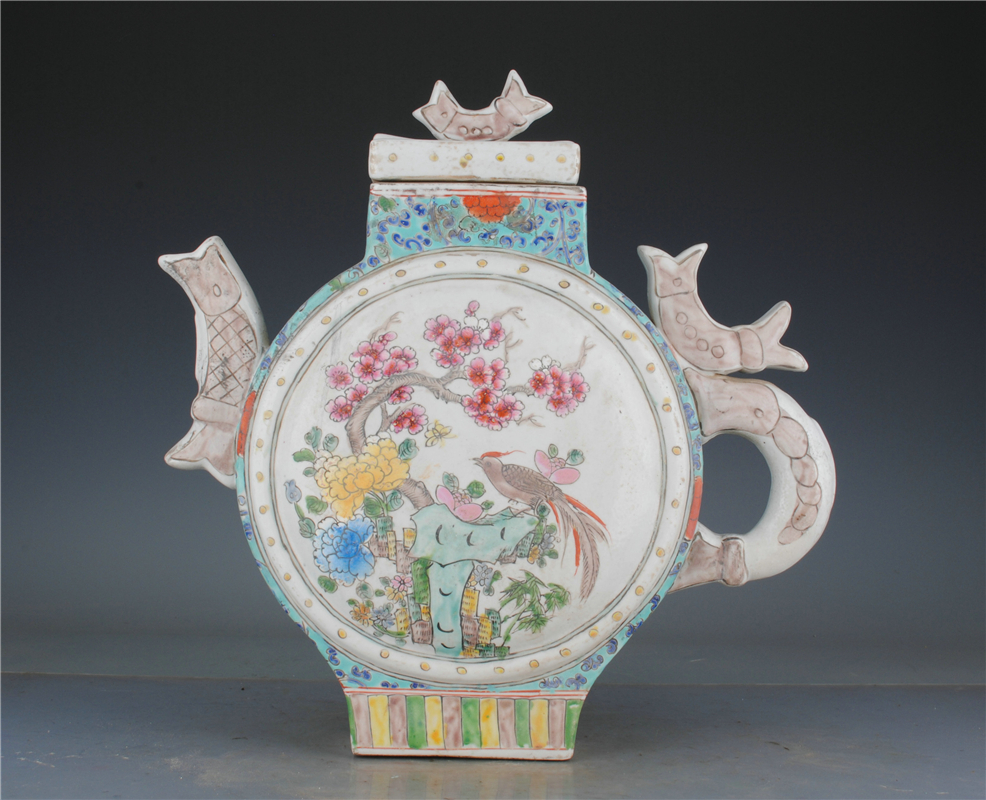 - 「清代 大清乾隆年製 古陶磁器 粉彩壺 花鳥紋 三魚壺 急須 茶壺一対 磁器」置物 琺瑯彩 古董品 骨董 旧家蔵出し 唐物 中国古玩 古美術品