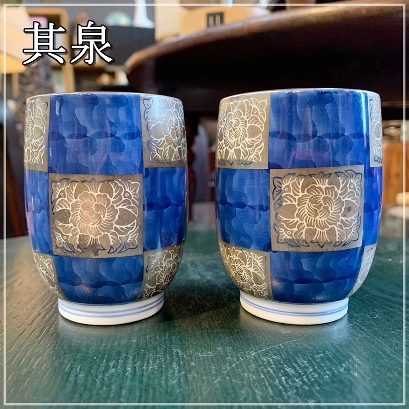 - 【福岡】其泉 銀呉須 牡丹 湯呑 2客セット 有田焼 ペア 染付 和風 和食器 銀彩 湯飲み 湯呑み kisen【RU0825-1】