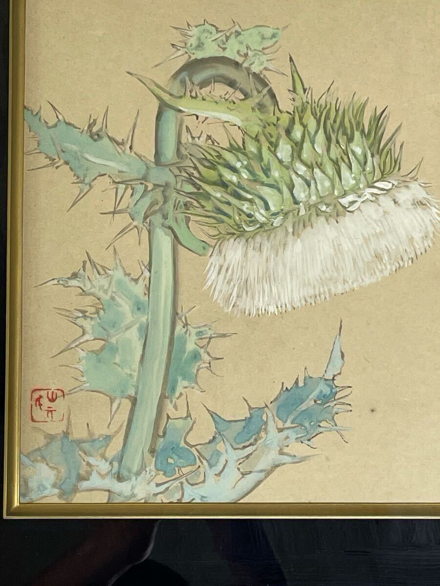 - 【真作】あざみの花 外額縁H42W39 山元櫻月 山紫水明 山野草 色紙絵 水彩画 日本画 色紙額縁k1 風景画 絵画 額装