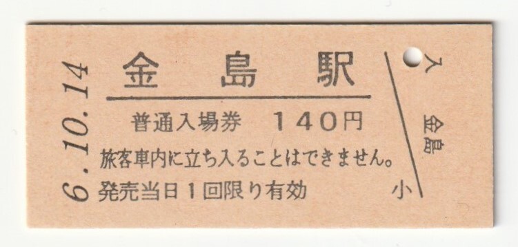 - 平成6年10月14日 吾妻線 金島駅 140円硬券普通入場券(日付印刷)