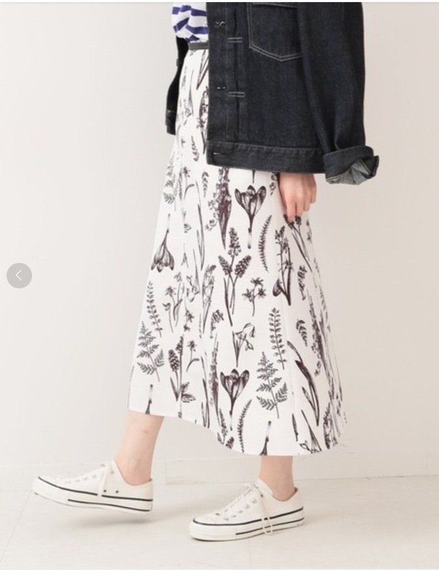 - IENAイエナジュイプリントグログランスカート◆きれいめフラワー植物プリント柄フレアAラインアローズジャーナルトゥモローplageホワイト系