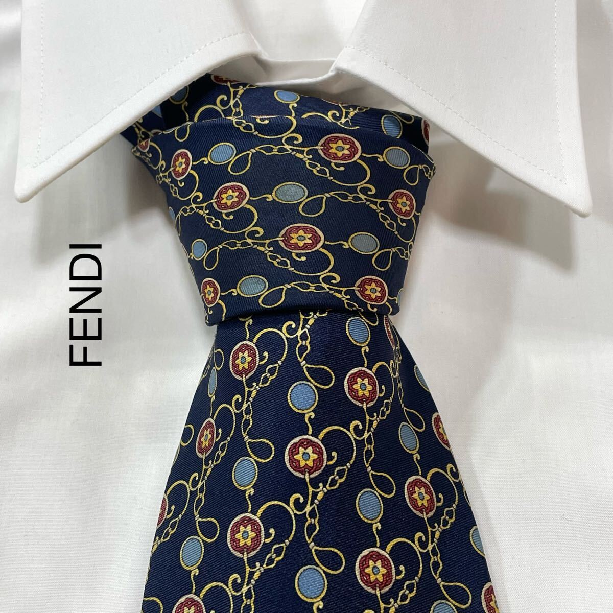 - FENDI フェンディ パターン柄 シルク ネクタイ イタリア製 ネイビー TG2235