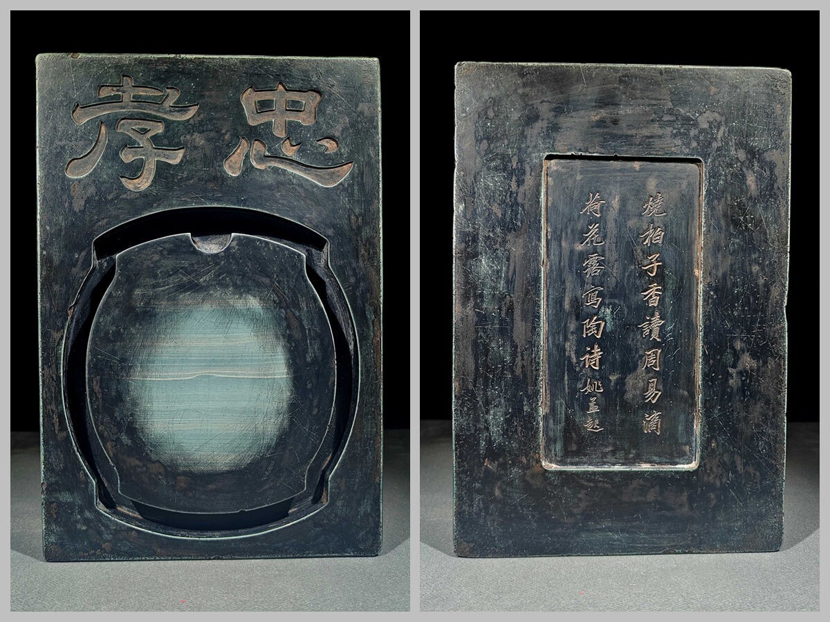 - 古びた蔵『清代 松花石彫り 忠孝文房硯 姚孟起銘』極細工 文房具 書道具 古賞物 古美術 中国古玩