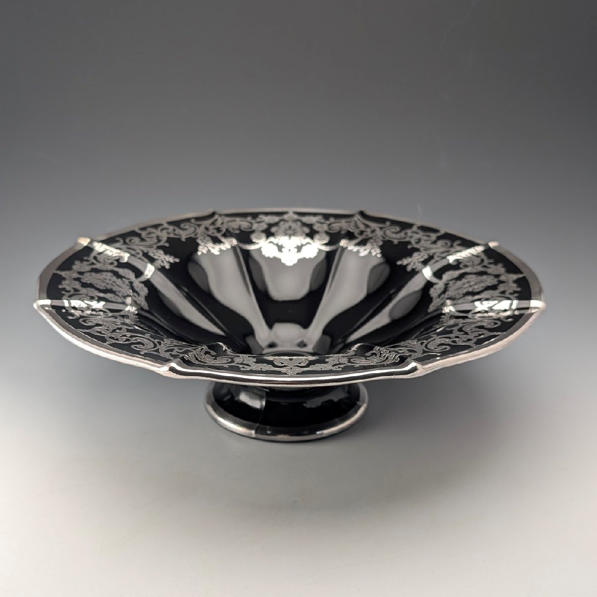 エボニー(黒檀)ガラスと呼ばれる黒いガラスに、シルバーオーバーレイによる細密な装飾のコントラストがとても美しいボウルです。