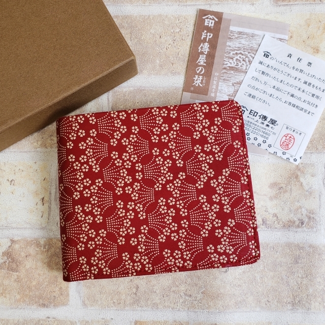 - 未使用 印伝 インデン 印傳屋 小桜菖蒲柄 鹿革 二折財布 レッド 財布 小銭室有 財布