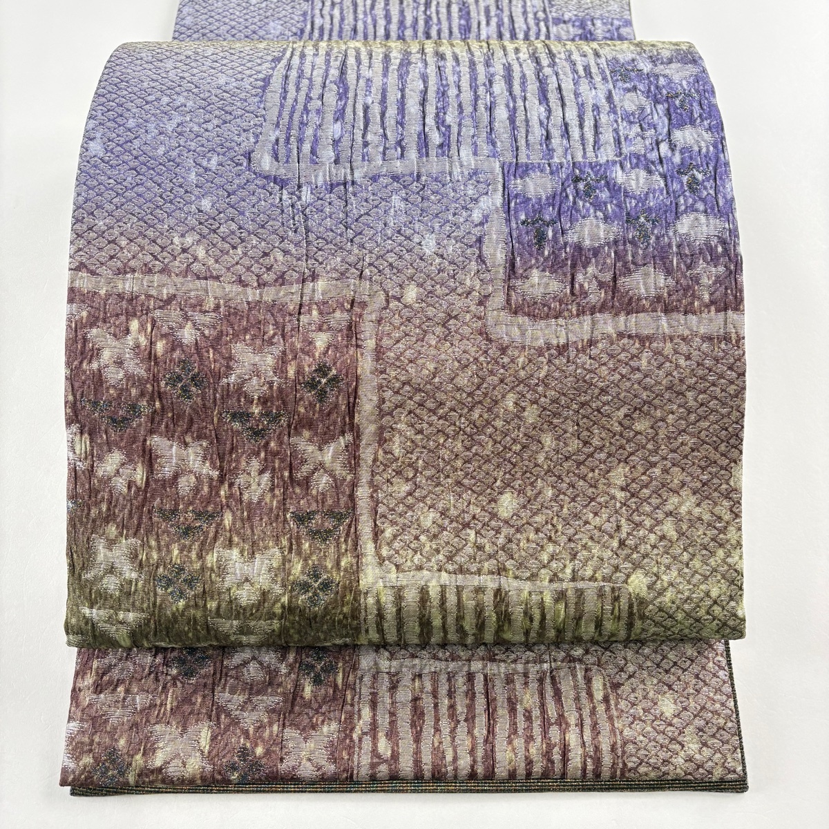 - 袋帯 美品 名品 幾何学 疋田柄 箔 茶緑色 全通 正絹 【中古】