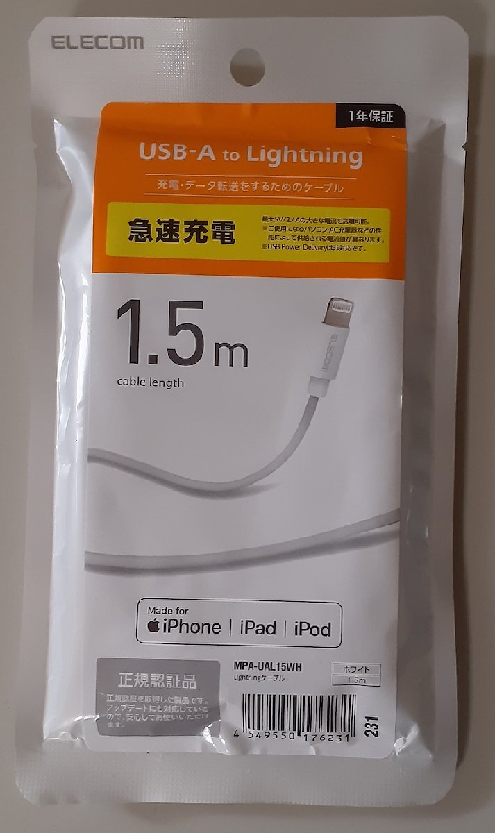 > 5953 未使用、未開封 ELECOM MPA-UAL15WH USB-A to Lightningケーブル 1.5m 正規認証品 スリムタイプコネクタ