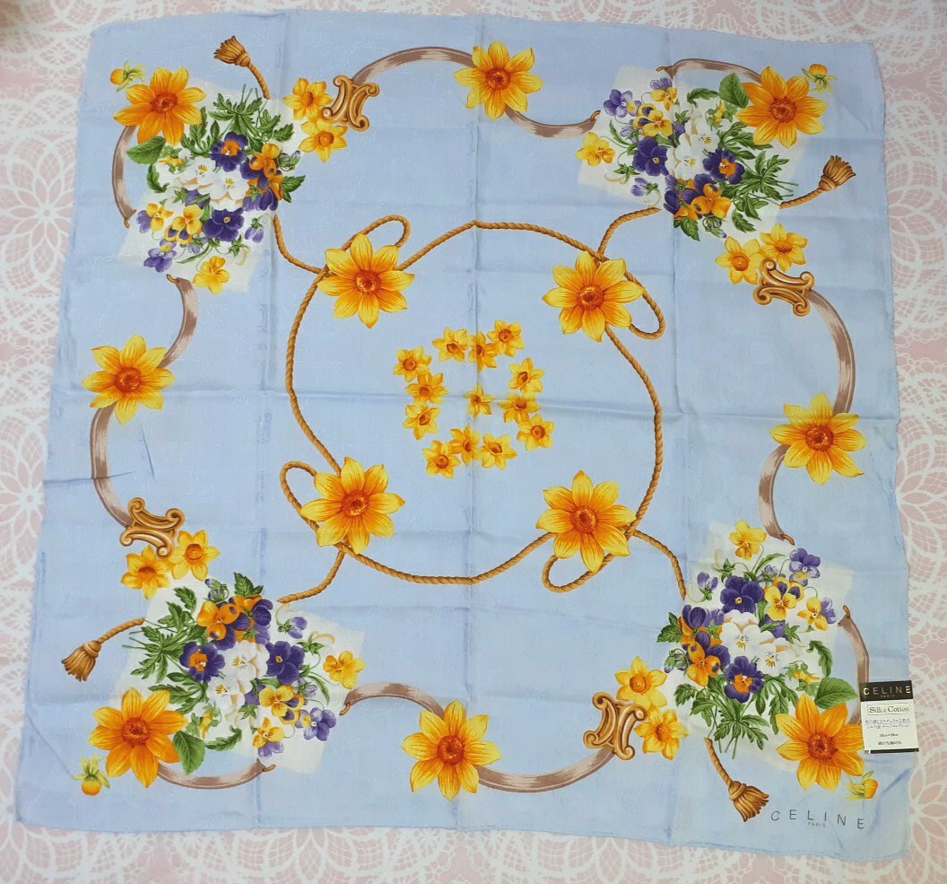 - 11 V5■ 未使用 CELINE 大判 ハンカチ コットン シルク セリーヌ ロゴ 花柄 パンジー 水色 スカーフ 綿 絹 3364