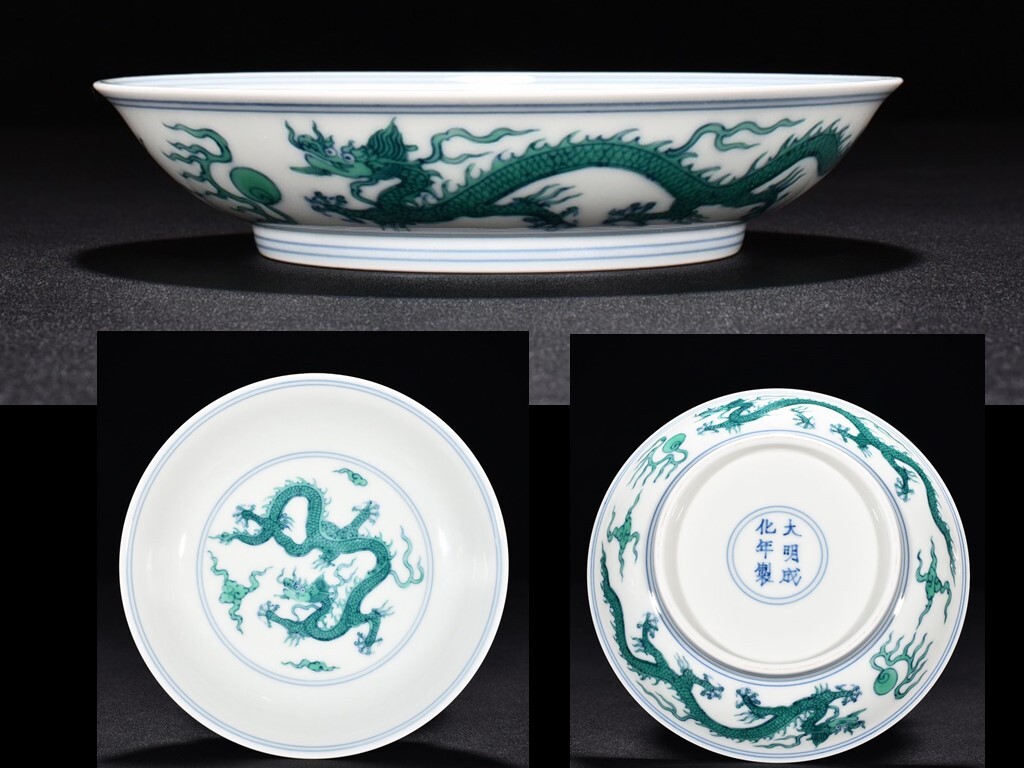 - TB260■中国古玩 唐物 明成化緑彩雲龍紋盤 時代物 極上品■高さ3.2cm・直径15.2cm■