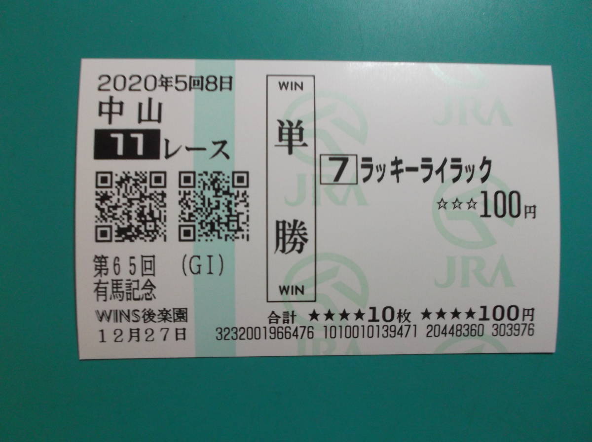 - お選び下さい(①②の内)ラッキーライラック(引退レース)第65回有馬記念(GI)はずれ馬券 ① 単勝100円 ②複勝100円