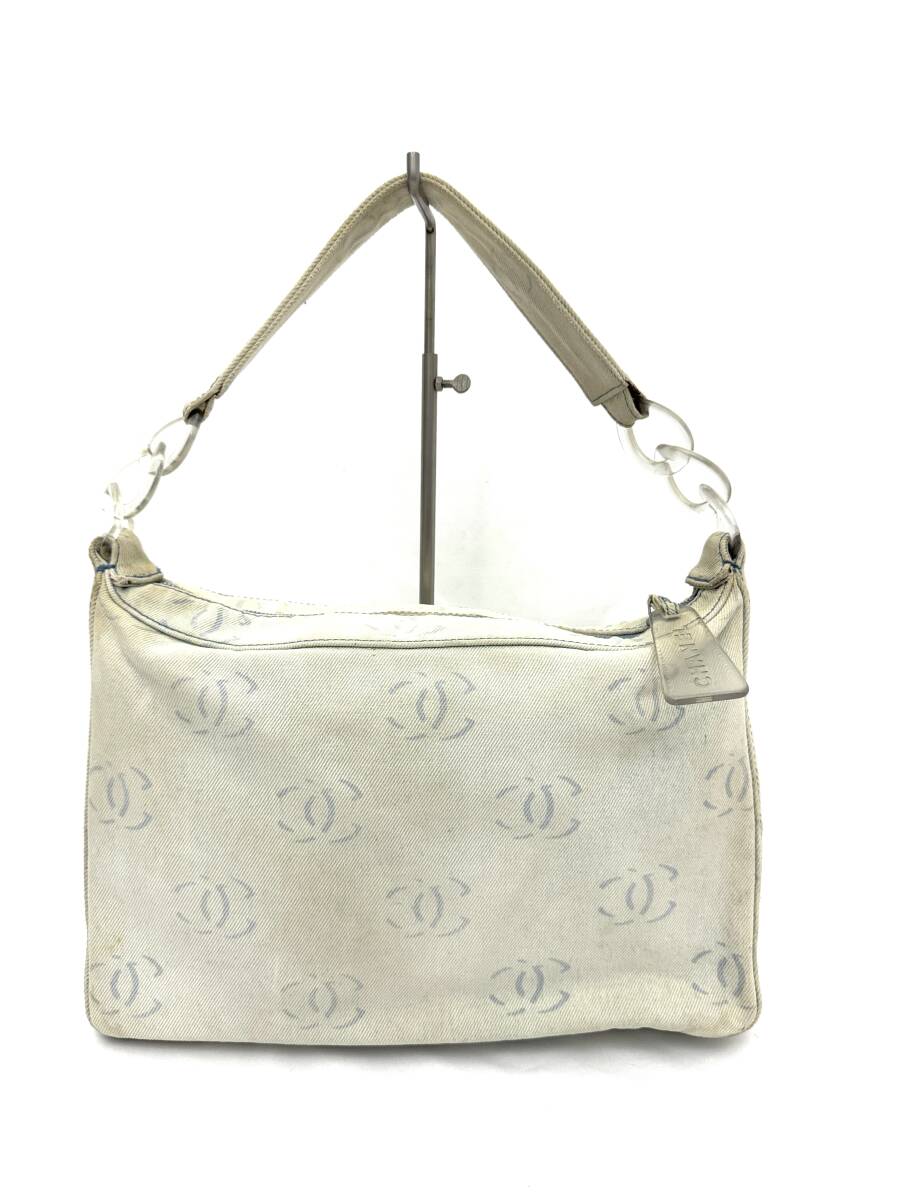 - 7F2202【本物保証】 シャネル プラ チェーン ショルダー ハンド バッグ デニム ココマーク 柄 ロゴ プレート CHANEL