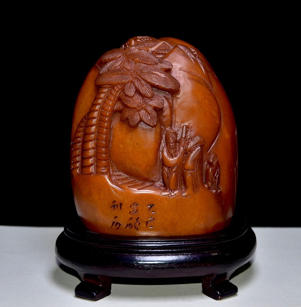 - 蔵友旧蔵出 寿山石 田黄石 細密彫 鬆下老人紋 印章 箱付 貴重品 稀少物品 置物 賞物 中国時代美術品