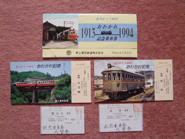 - 野上電鉄ありがとう80年おわかれ記念乗車券/代替券2枚組(廃止/廃線/廃車/自主廃業/事業停止/会社解散/会社清算/大十バス/大十オレンジバス)