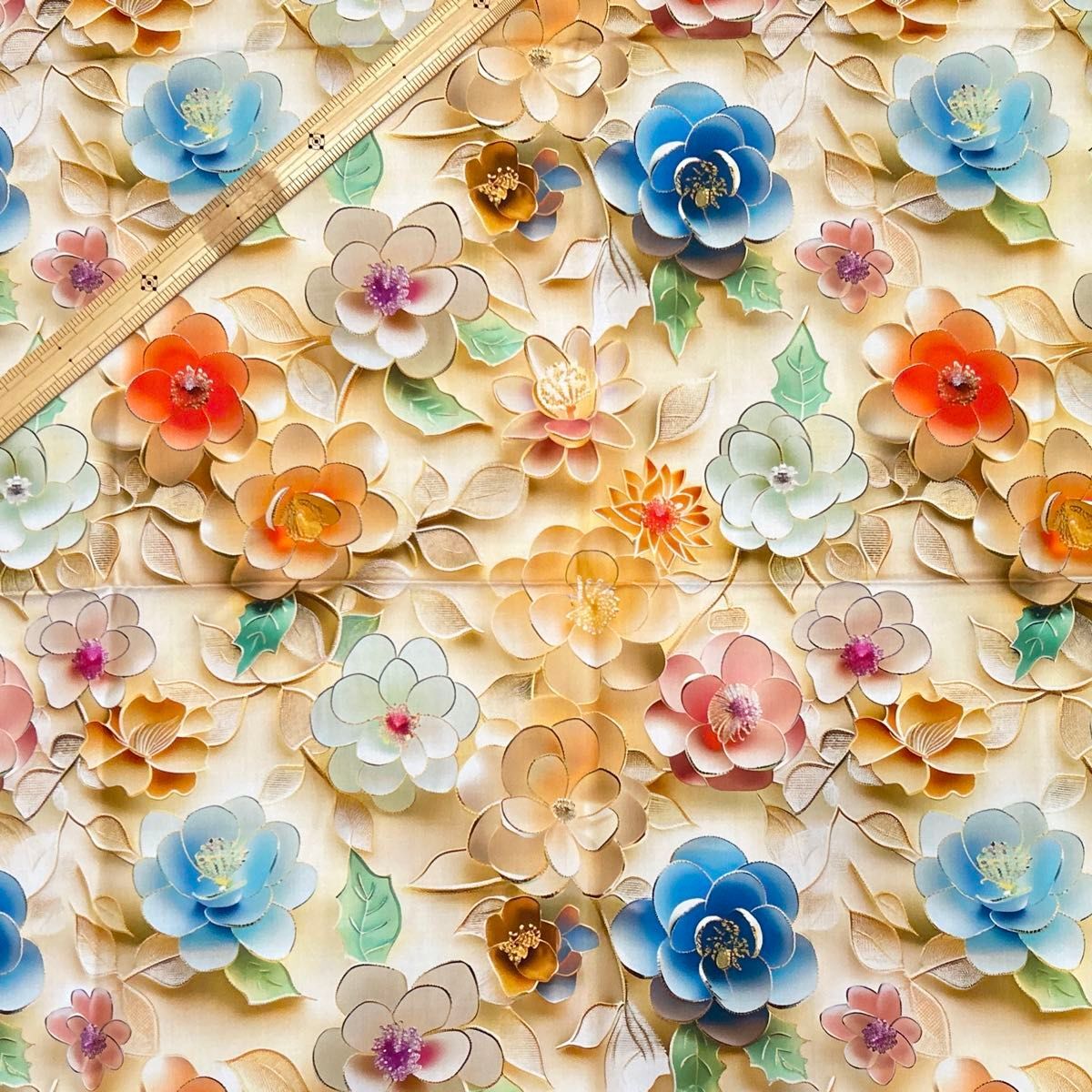- D69 3D立体プリント生地 花柄 陶器のような花 コットン100%生地 ハギレ 生地 ハンドメイド 輸入生地